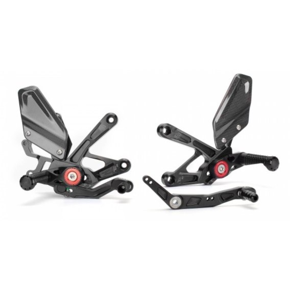 Pozycje podnóżków oraz dźwigni hamulca i zmiany biegów można dowolnie regulować według własnych życzeń. Podnóżki są ustawiane za pomocą kombinacji regulacji przesuwanych i obrotowych w jednym punkcie, więc wybór jest niezwykle szybki i łatwy (pięć pozycji przez przesuwanie i cztery pozycje przez obracanie). Konwersja na przełączanie wsteczne odbywa się po prostu przez przekręcenie ramienia zmiany biegów. Dźwignie hamulca i zmiany biegów są wyposażone w podwójne łożyska kulkowe, co zapewnia idealnie bezluzowe działanie dźwigni, elementy można regulować według uznania za pomocą mimośrodów. Carbonowe ochraniacze pięt po obu stronach. Ten system jest wyposażony w składane kołki.