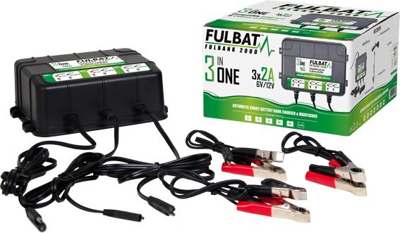 FULBAT Fulbank 2000, uniwersalna ładowarka z 3 osobnymi złączami, przeznaczona do akumulatorów 6V i 12V o pojemności od 4Ah do 40Ah (120Ah w trybie konserwacji).